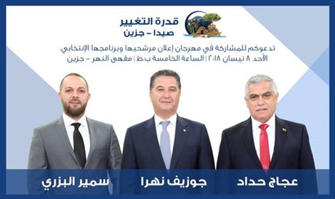 أعلنت لائحة “قدرة التغيير” عن دائرة جزين في مقهى النهر – جزين بحضور كل من وزير الإعلام ملحم الرياشي ممثلًا رئيس حزب “القوات اللبنانية” سمير جعجع والوزير السابق سليم الصايغ ممثلًا رئيس حزب “الكتائب” سامي الجميل، وضمّت كل من: مرشح “القوات اللبنانية” عن المقعد الكاثوليكي في دائرة الجنوب الأولى عجاج حداد، مرشح “الكتائب اللبنانية” عن المقعد الماروني في دائرة الجنوب الأولى جوزيف نهرا، مرشح “تجمع ١١ اذار” عن المقعد السني في دائرة الجنوب الأولى سمير البزري.